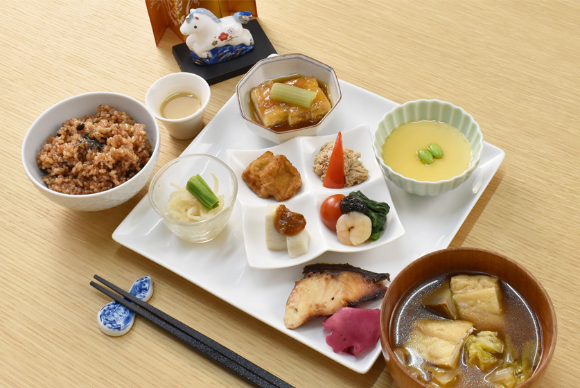 糀料理と『もっちもち』の寝かせ玄米、季節の実沢山のお味噌汁など、酵素が活きている糀を使ったメニューでおもてなしいたします。
