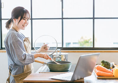オンライン参加の場合は、事前にお渡ししたレシピを参考にご自宅で調理できます。また、Zoomのチャット機能で先生に質問することも可能です。