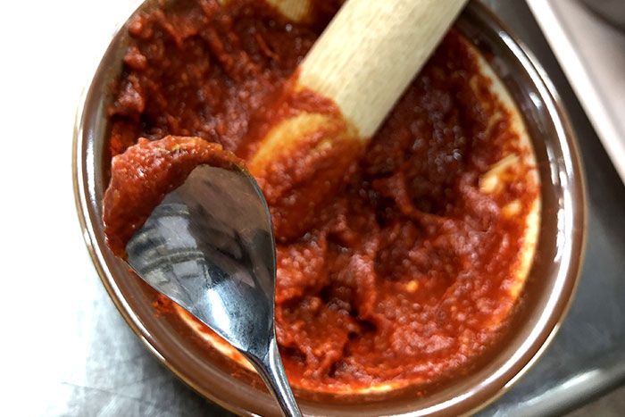 まず、〘いしる糀〙やパウダーの韓国唐辛子、練酒粕、にんにくなどを使って旨辛糀ソースを作りました。